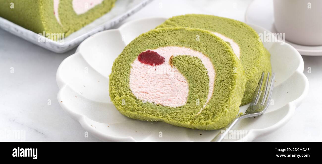 Delicious Matcha Swiss Roll Cake Slices With Strawberry Icing Cream On White Background Close Up Stock Photo Alamy